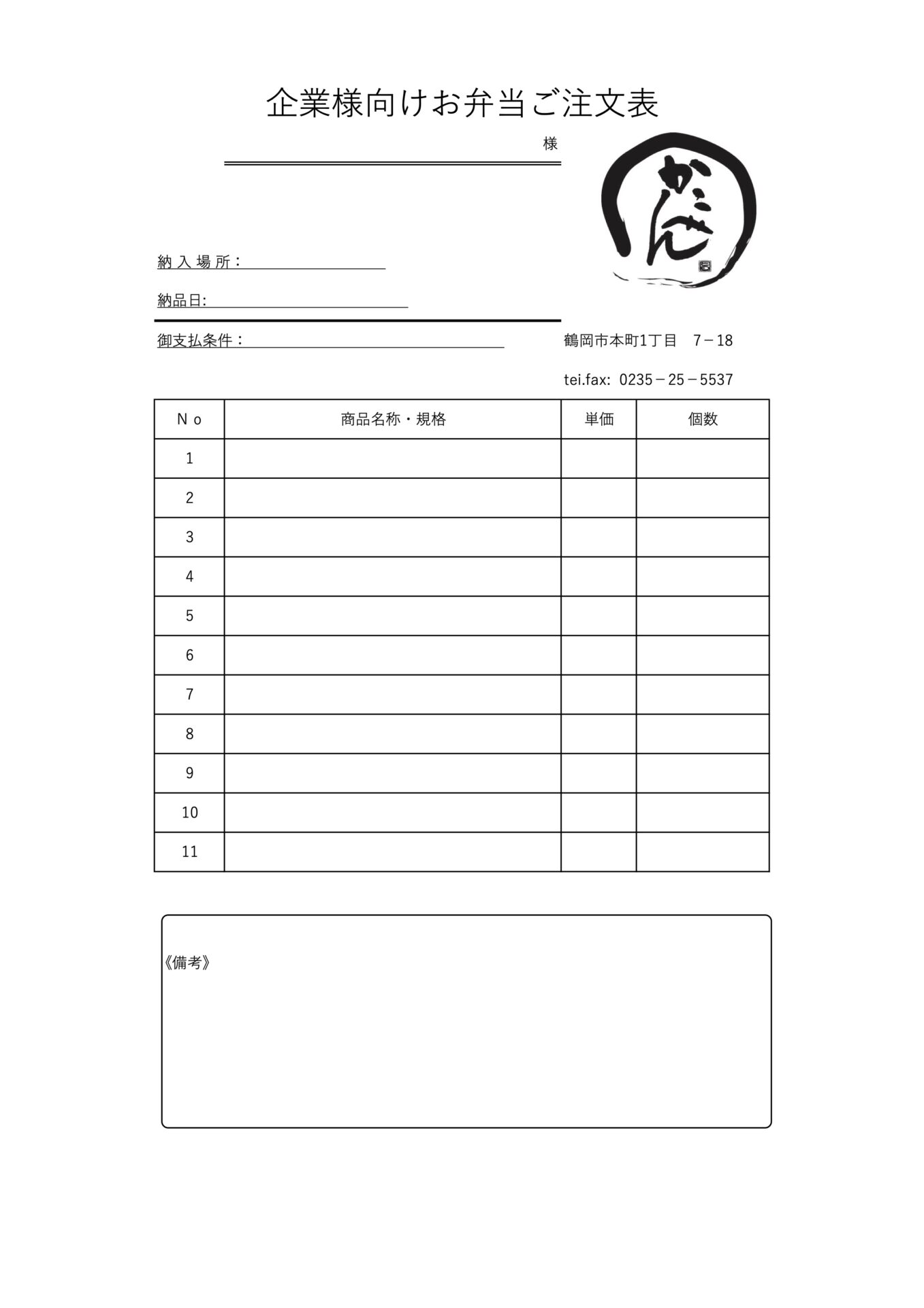 お問い合わせ CONTACT HOME» お問い合わせ» FAX番号 企業様向けのお弁当は、下記用紙へご記入のうえ配達等、確認がございますので5日前迄にFAXでお送りください。 ※備考欄へ担当の方の連絡先(携帯)等の記載もお願いいたします。 0235-25-5537